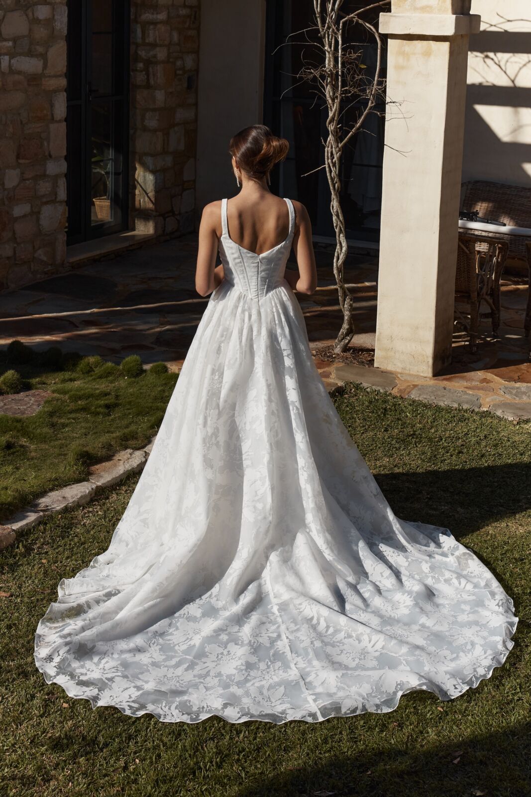 Description: Floral burn out voile organza A-lines Wedding gown with square neck boned corset bodice and sweeping train