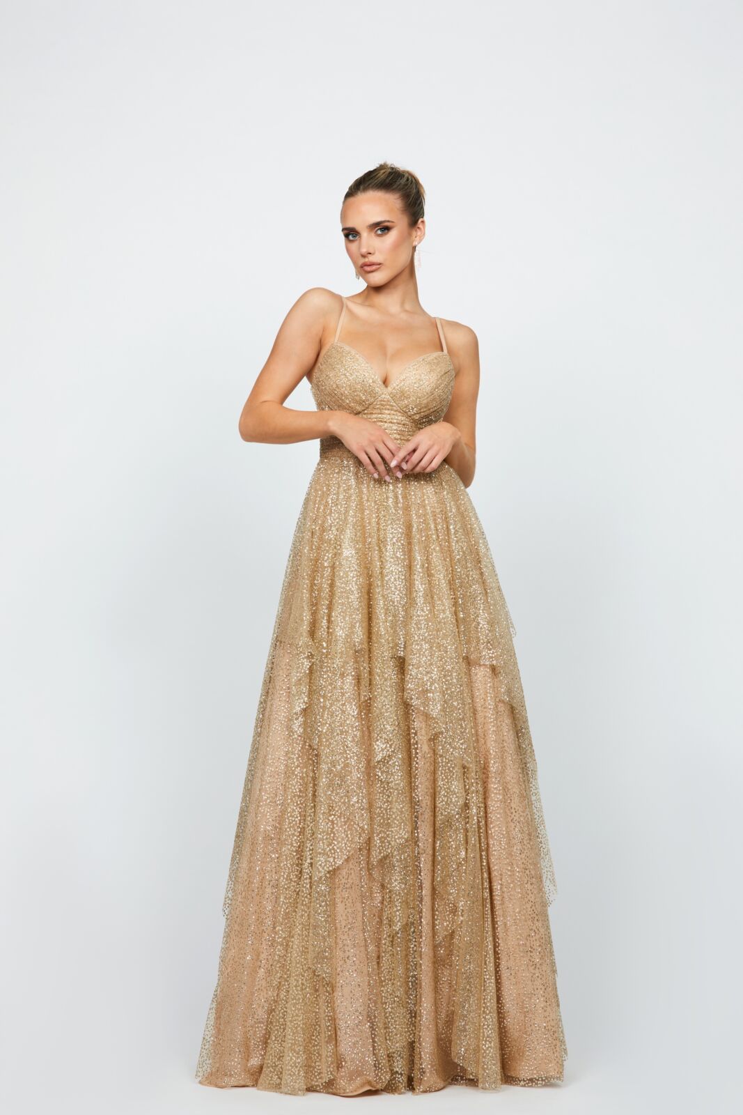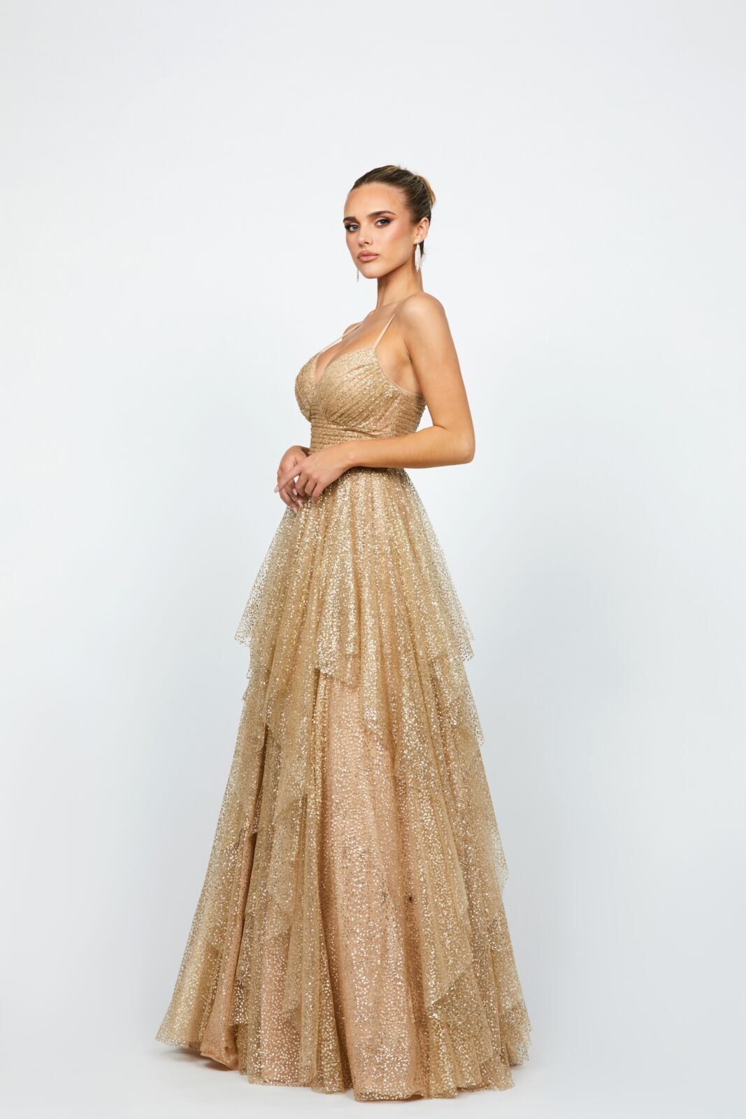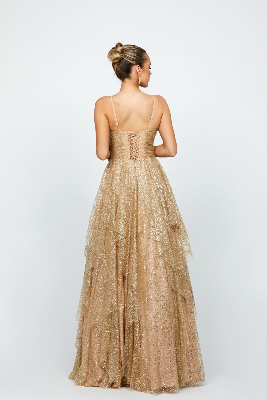 Description: V neck pleated waist band tulle A line ball gown with Course glitter over lay and tiered ruffle skirt