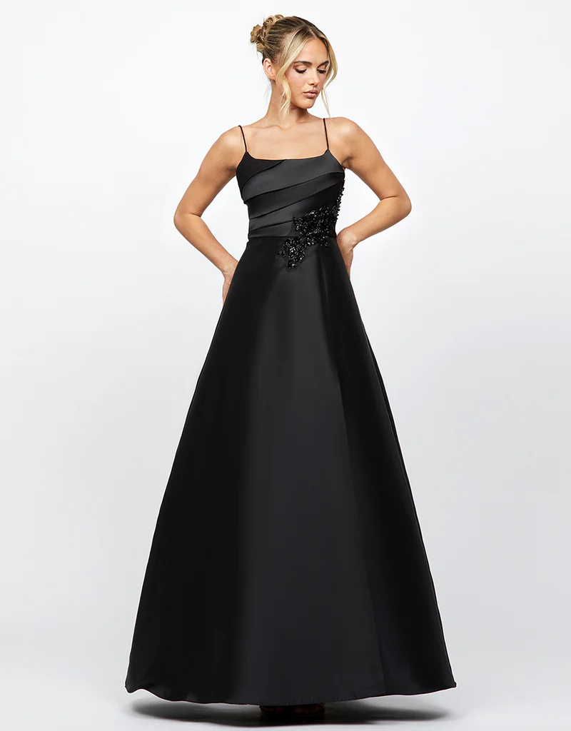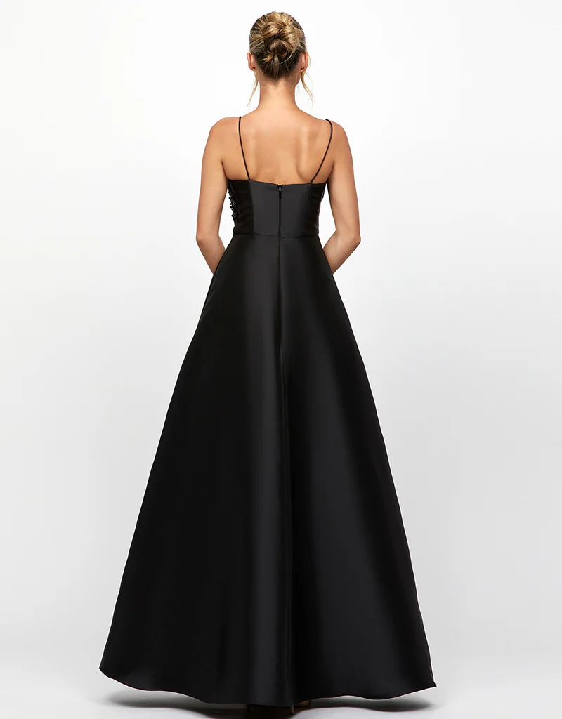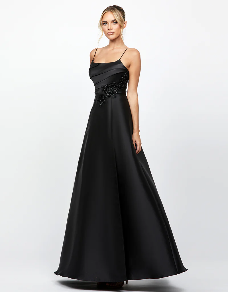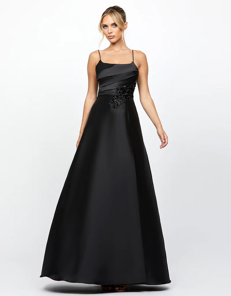 Description: Fitted pleat bodice mikado A line skirt gown with side waist beaded applique panel and front split