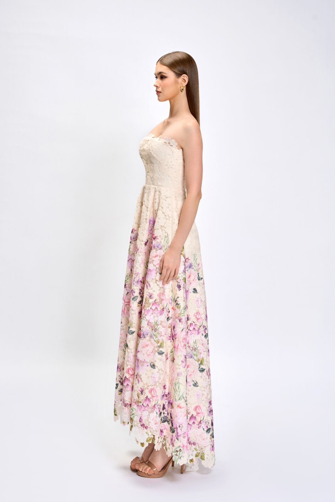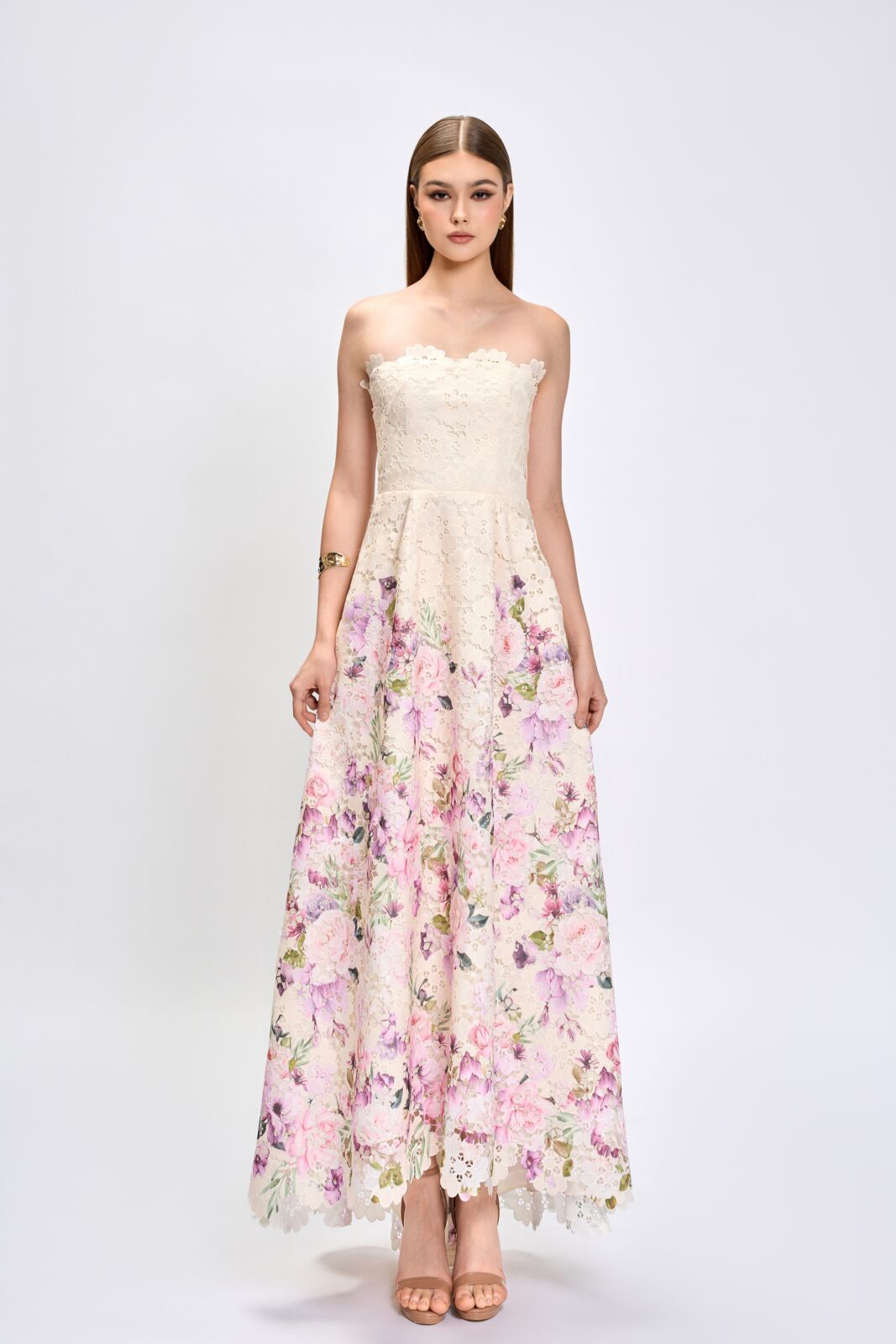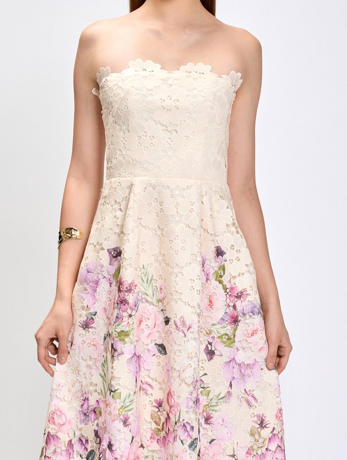 Description: Strapless fitted bodice lace A line cocktail dress with floral print skirt
