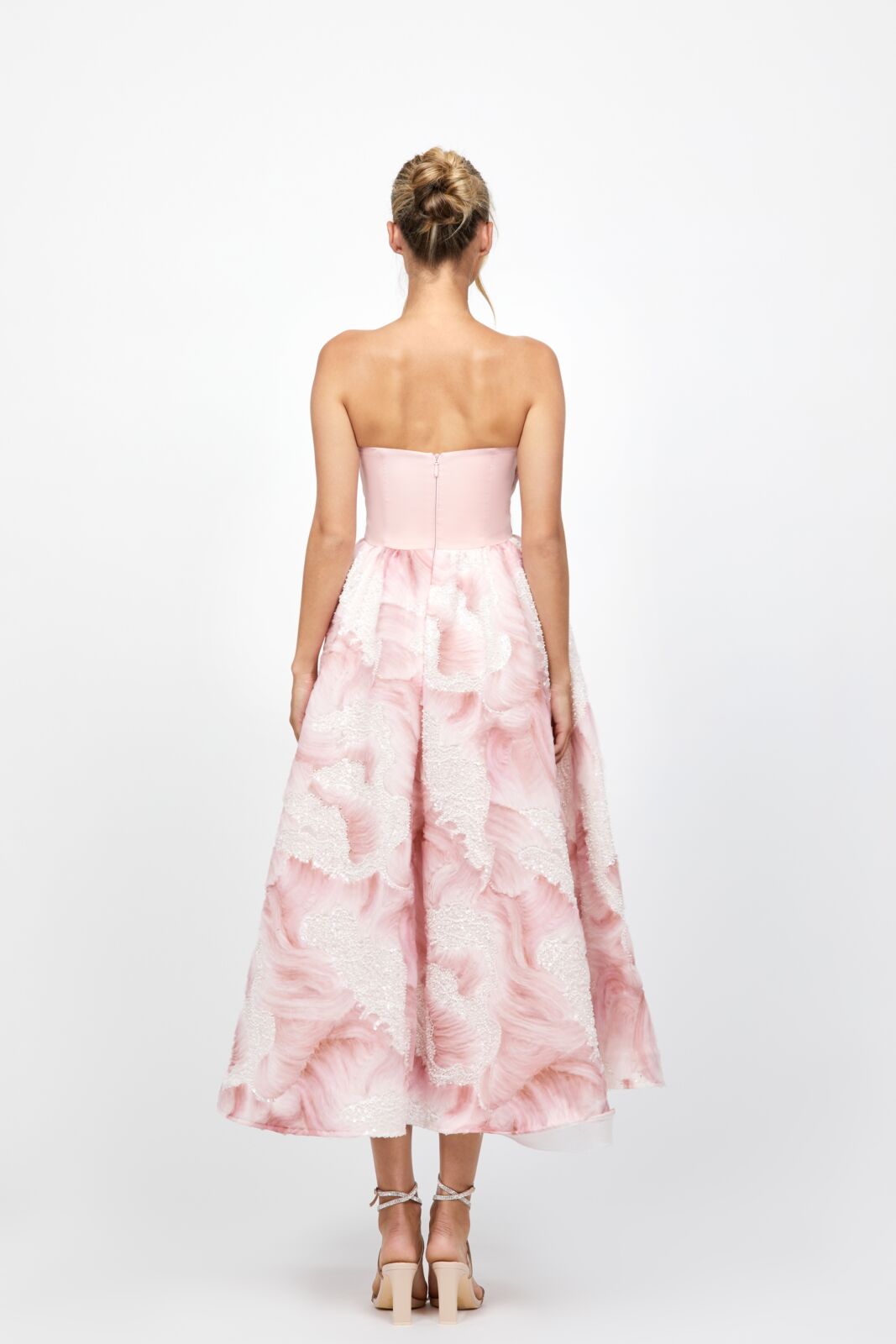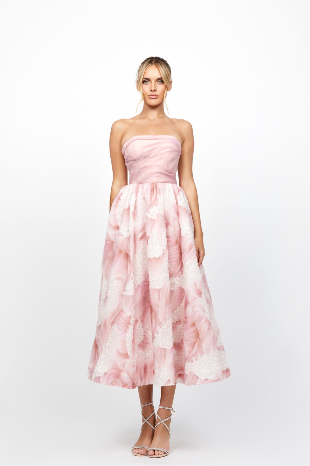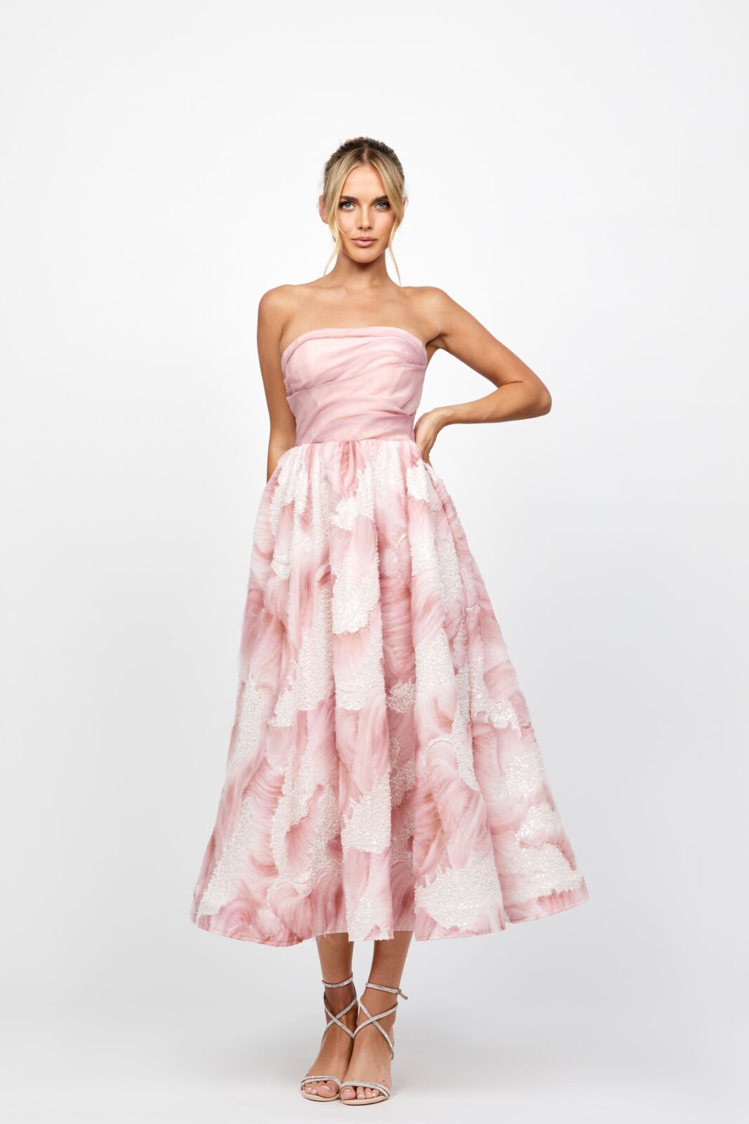 Description: Strapless fitted organza bodice A line cocktail dress with sequinned textured panel A line skirt