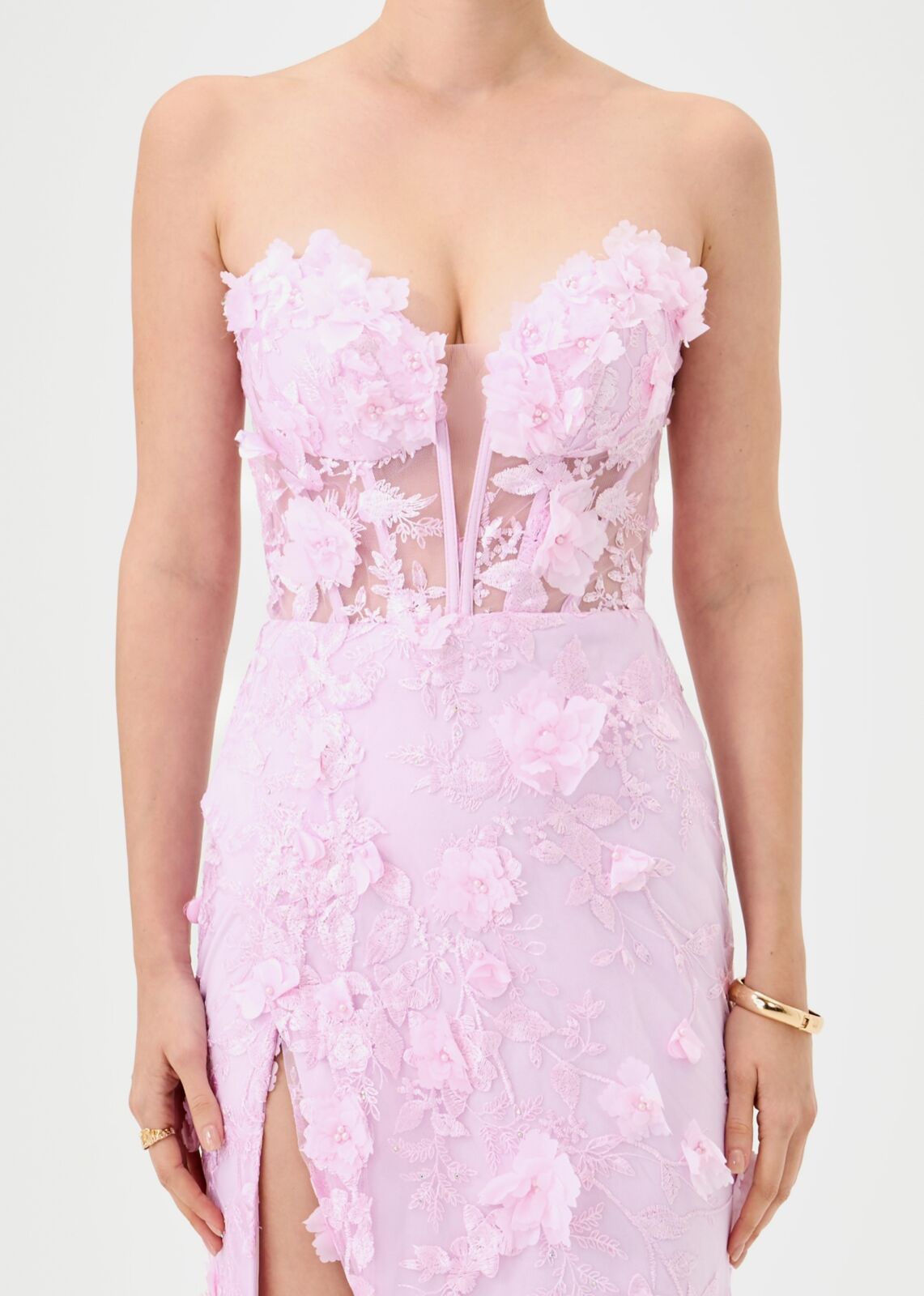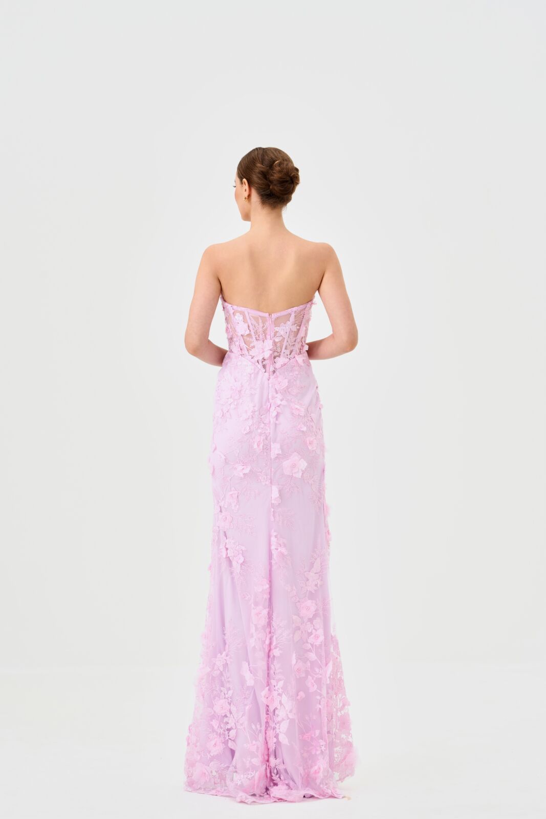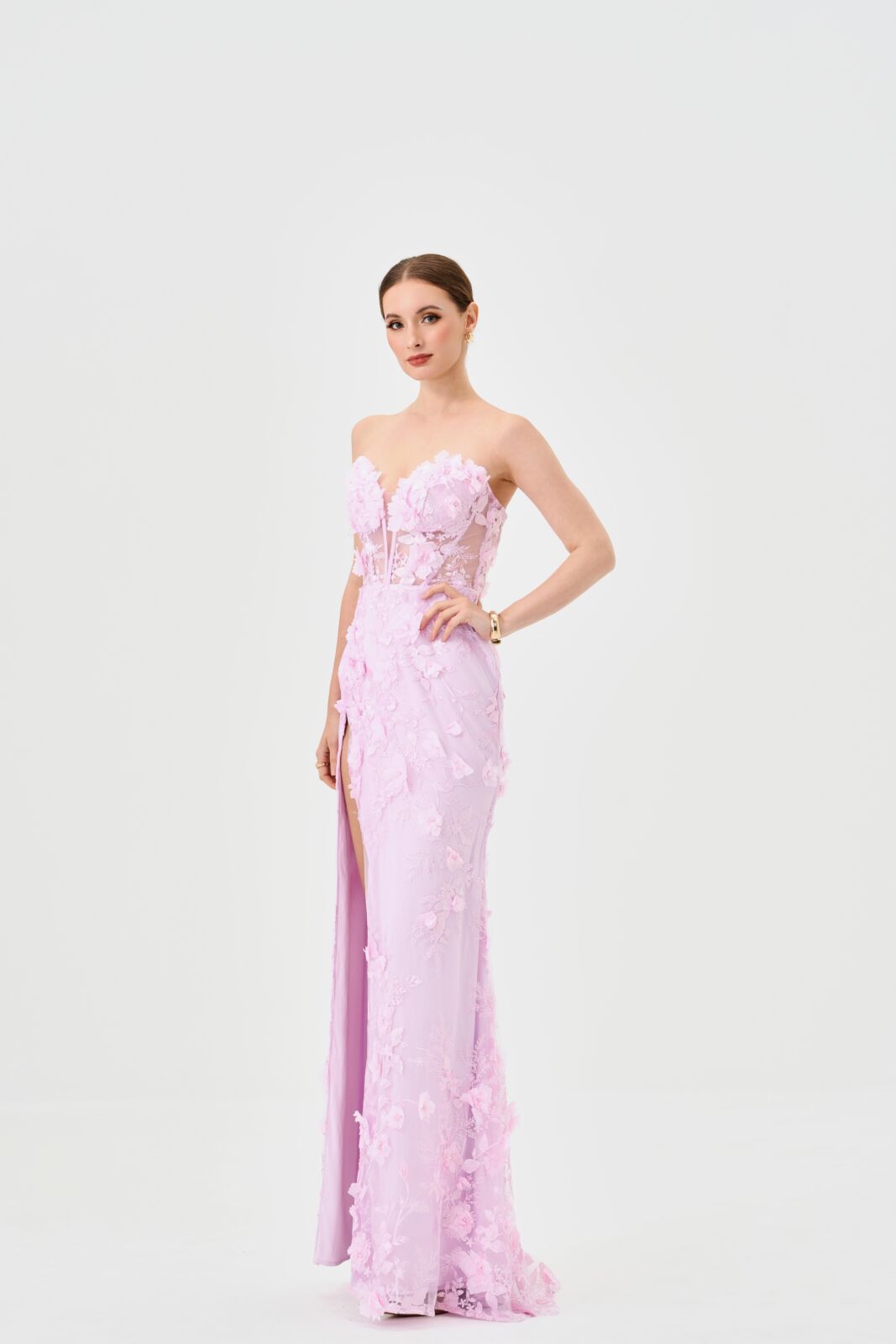 Description: Strapless sweet heart bodice slim line gown with high split and 3D floral petal over lay