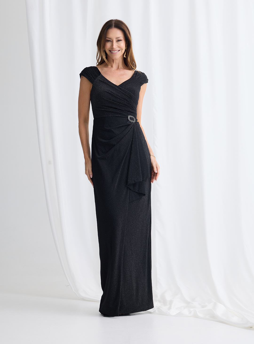 Description: Wrap bodice stretch sparkle knit slim line V neck gown with cap shoulders and drape front body