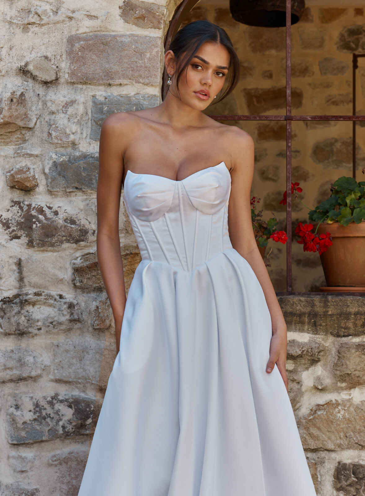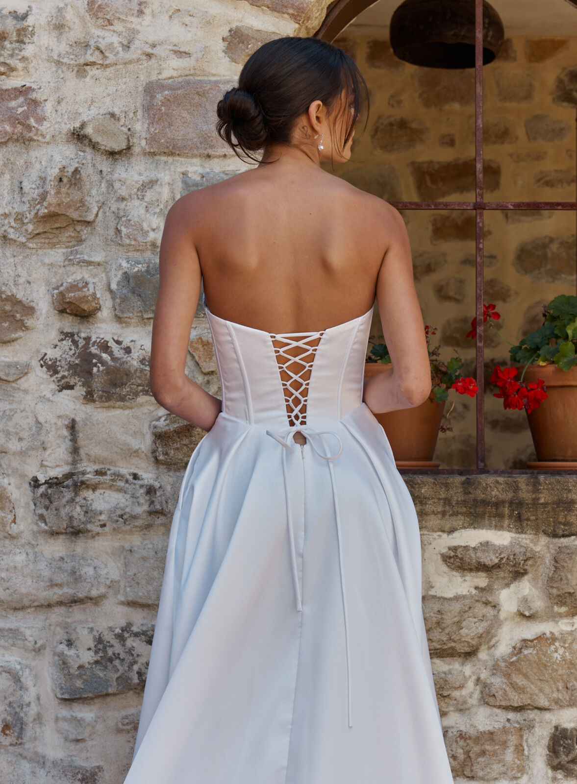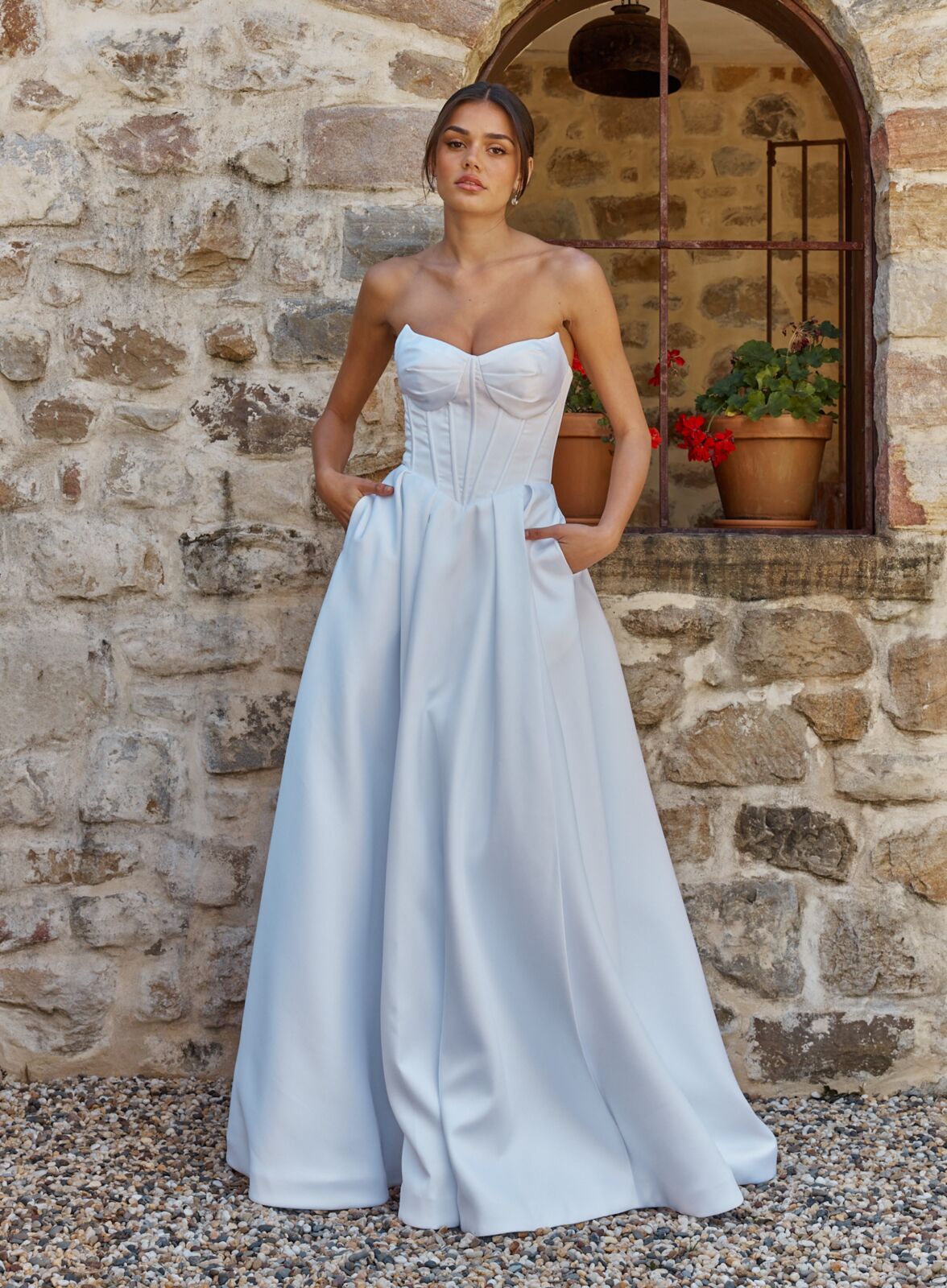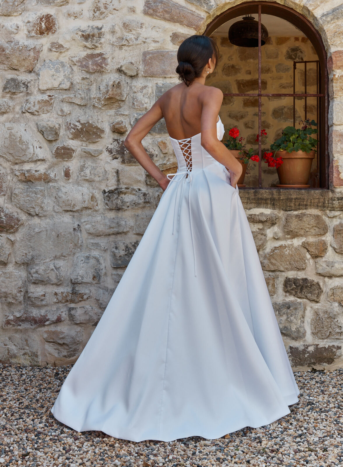 Description: Strapless pointed sweet heart boned corset bodice mikado ball gown with A line skirt and lace up back