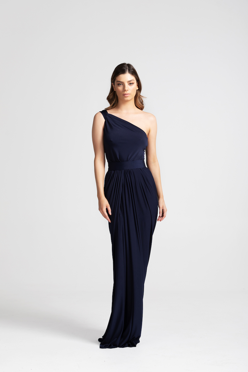 Description: Sweeping one shoulder fitted bodice ruched drape skirt gown with capped shoulder strap and side split