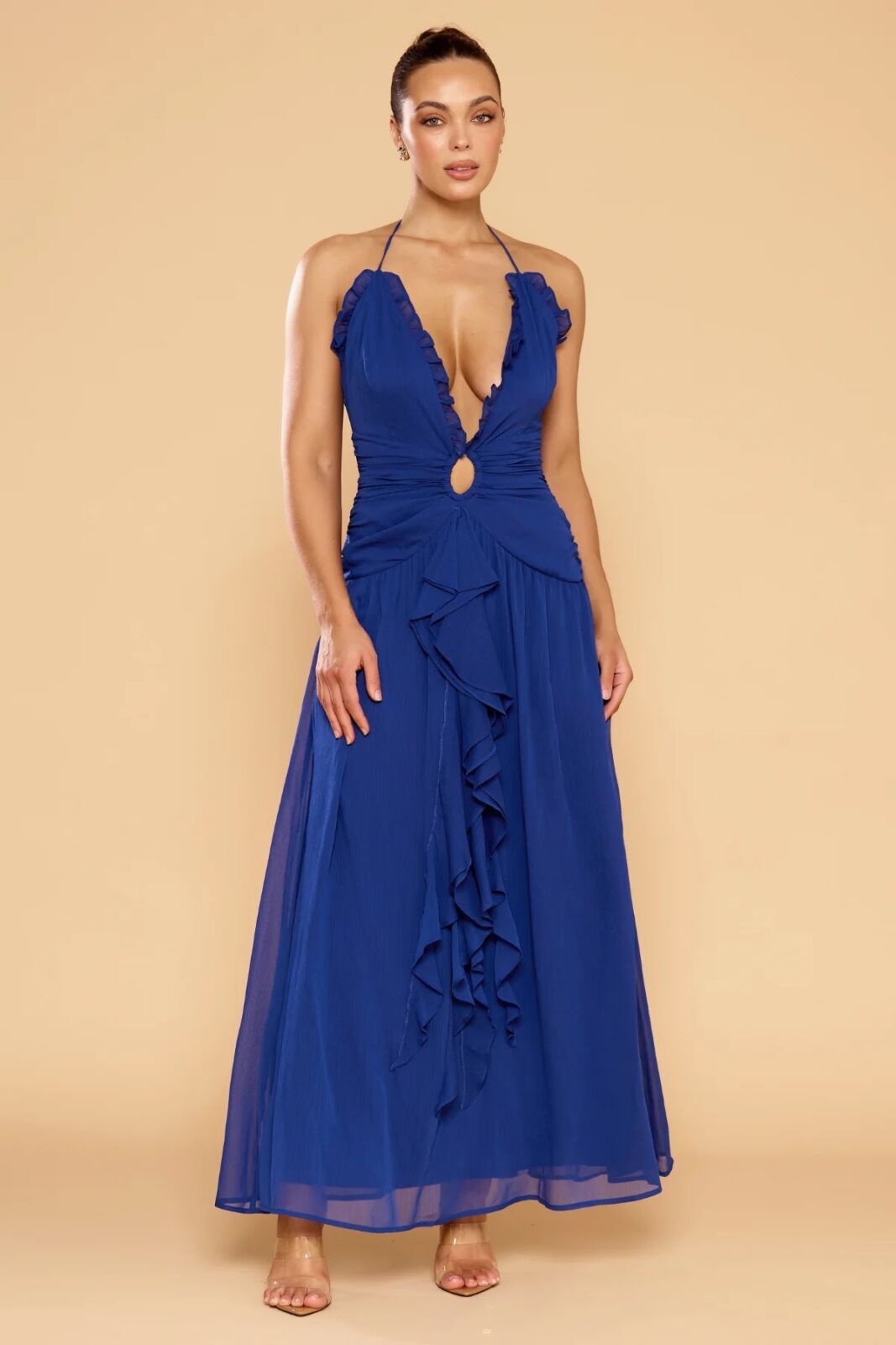 Description: Deep ruffle halter neck crinkle chiffon A line gown with key hole waist cut out and drape ruffle front skirt
