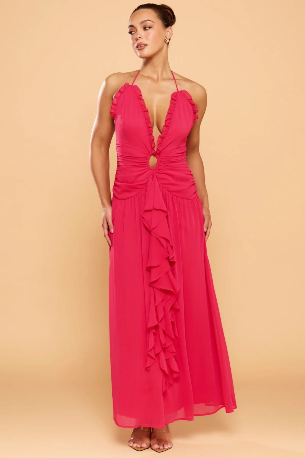 Description: Deep ruffle halter neck crinkle chiffon A line gown with key hole waist cut out and drape ruffle front skirt