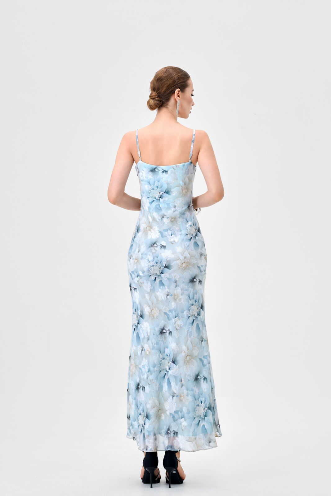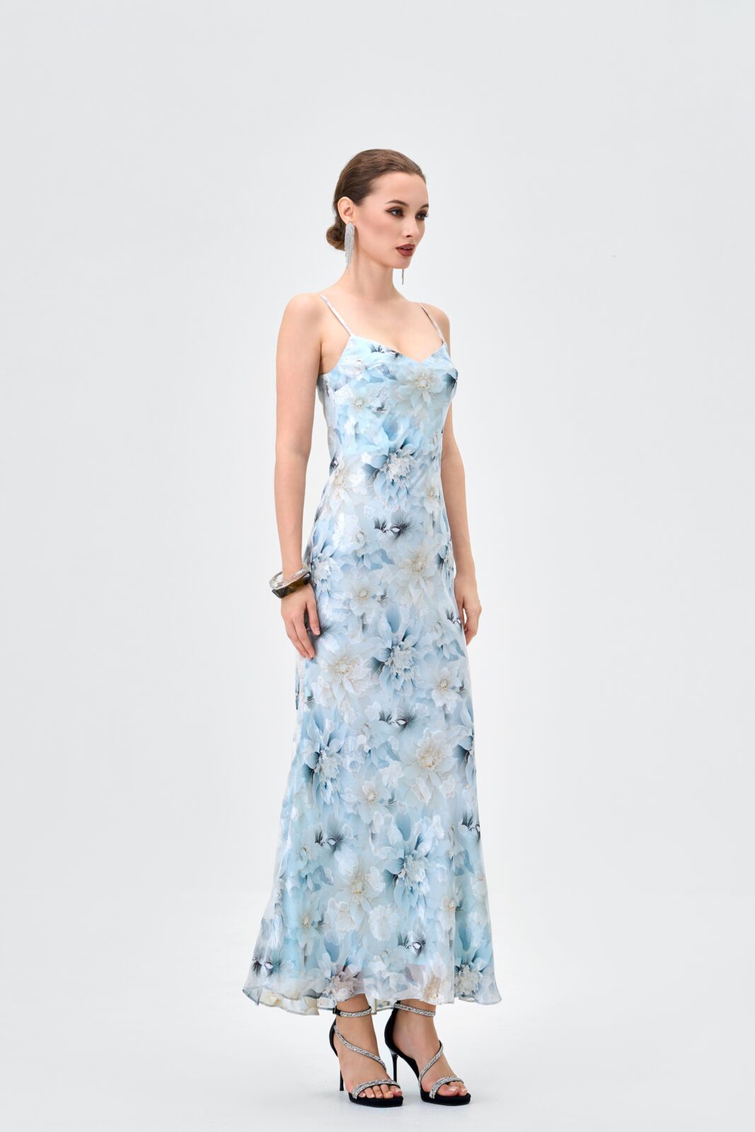 Description: Floral print metallic slip style maxi dress with fine shoulder straps