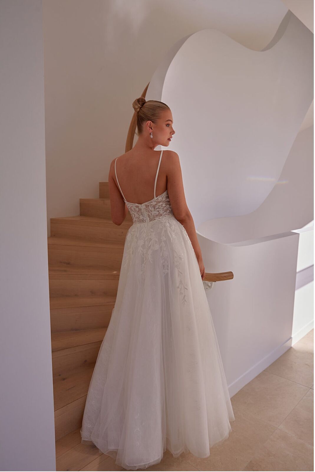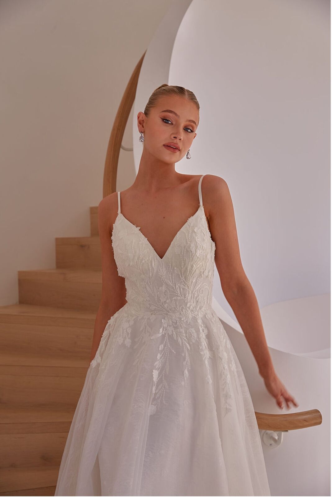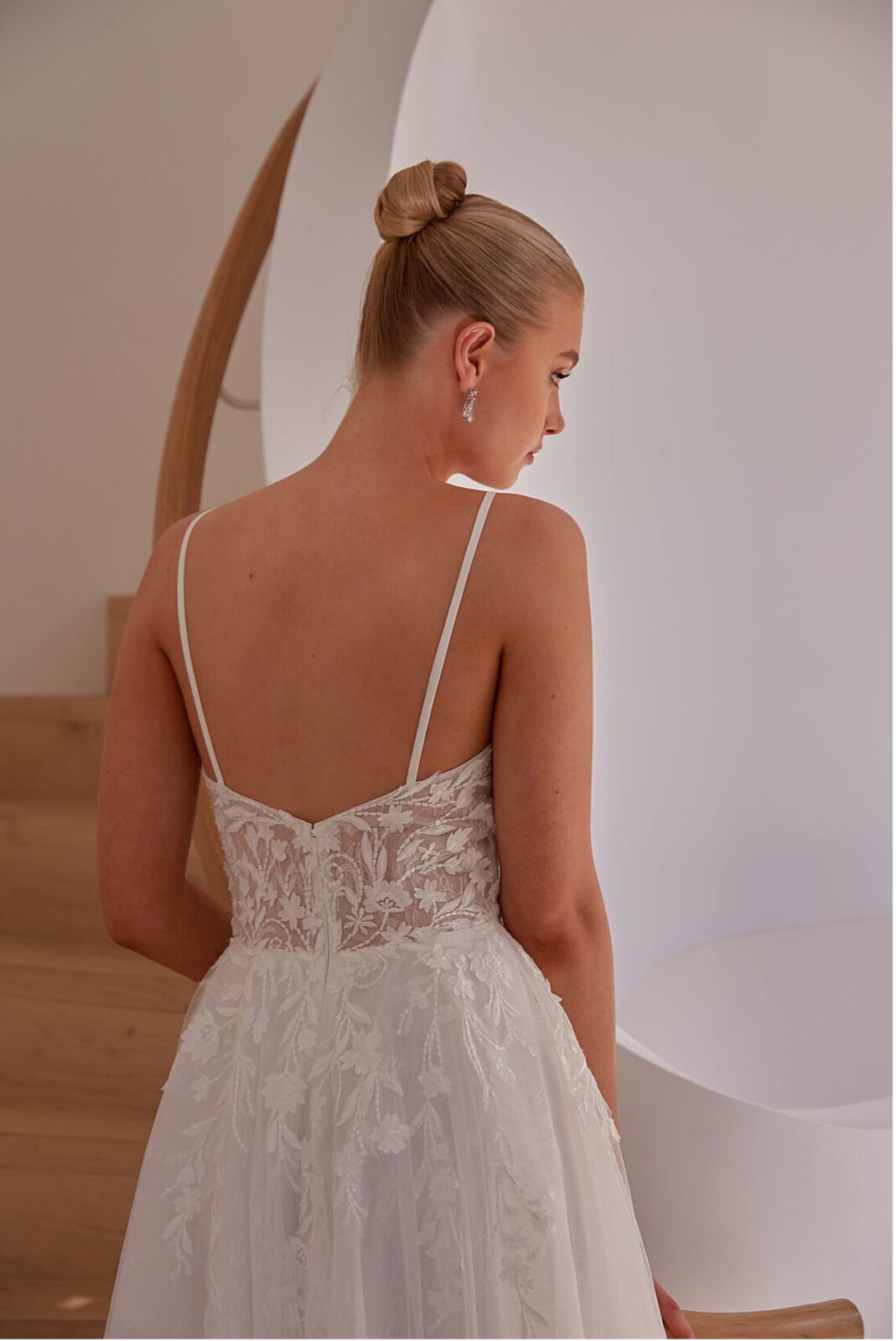 Description: V neck sequinned lace applique on tulle A line gown with delicate lace under lay and fine shoulder straps