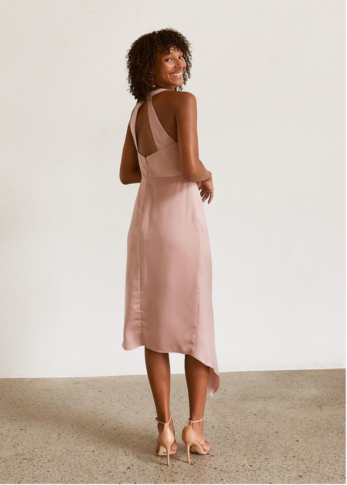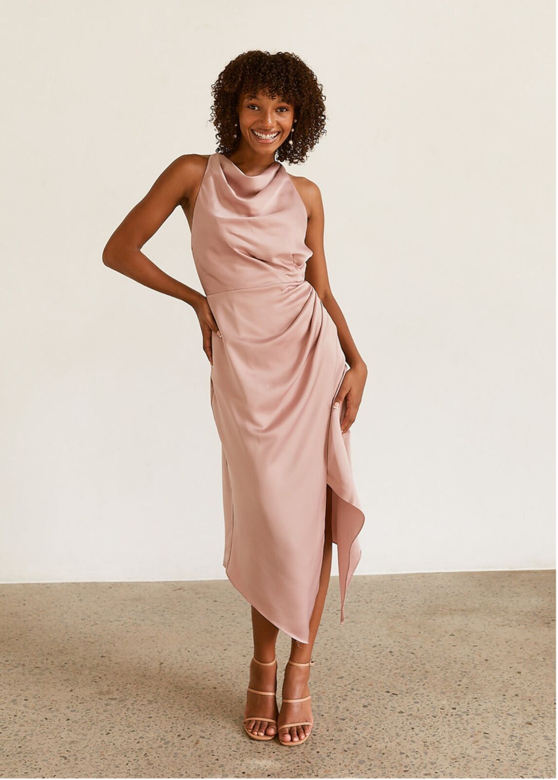 Description: Drape cowl halter neck satin midi dress with side gathered wrap front and A-symmetric hem