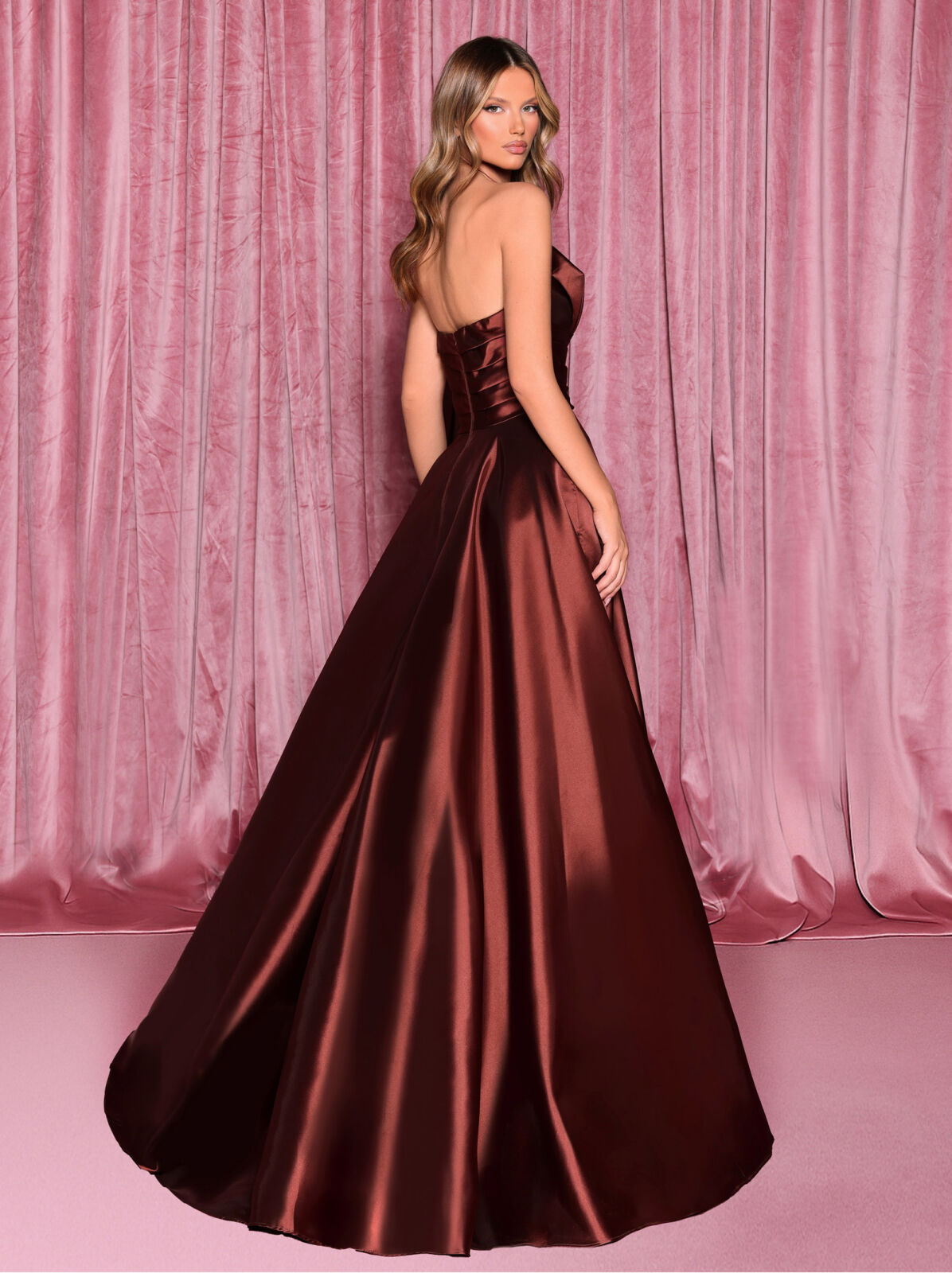 Description: Strapless mikado pleated waist band A line ball gown with A-symmetric bust line and split