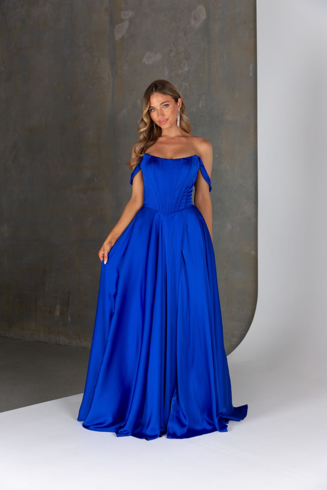 Description: Drop waist corset bodice silky satin flowing skirt ball gown with lace up back and drape off the shoulder straps