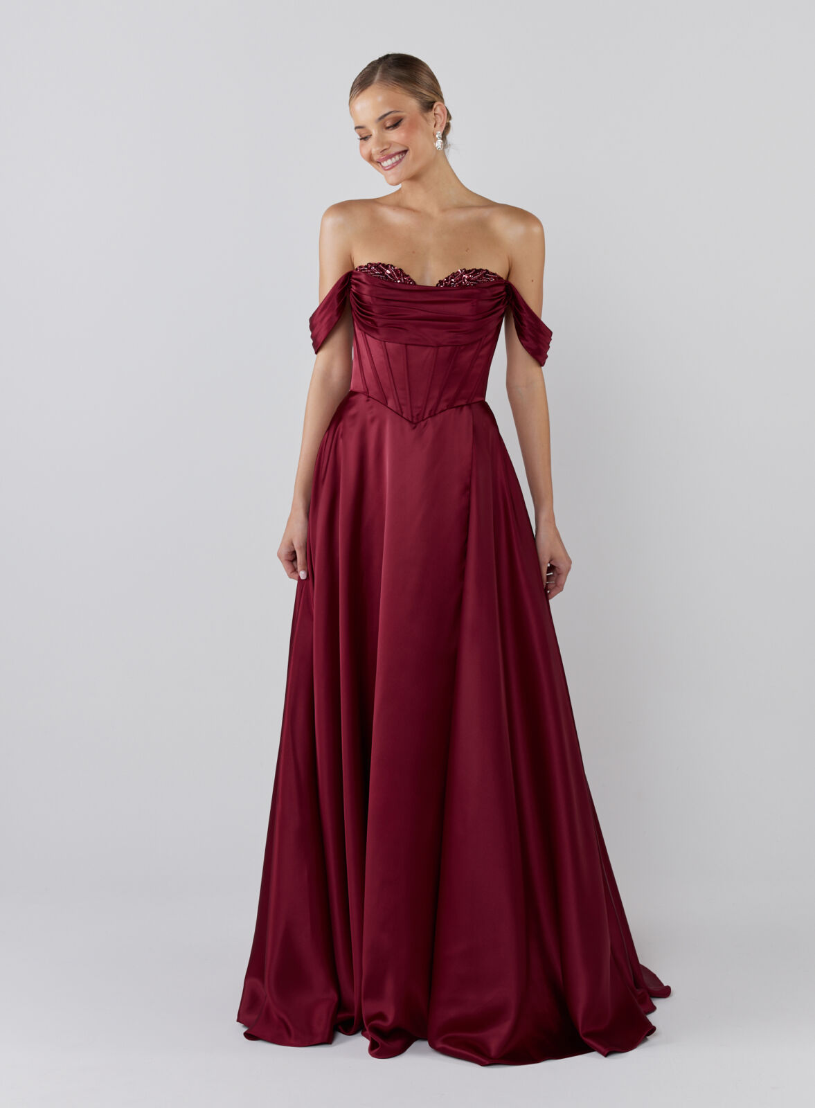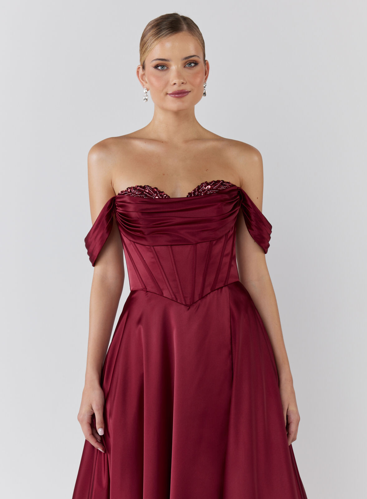 Description: Satin boned corset lace up back A line ball gown with beaded peep bust details and pleated drape off the shoulder straps