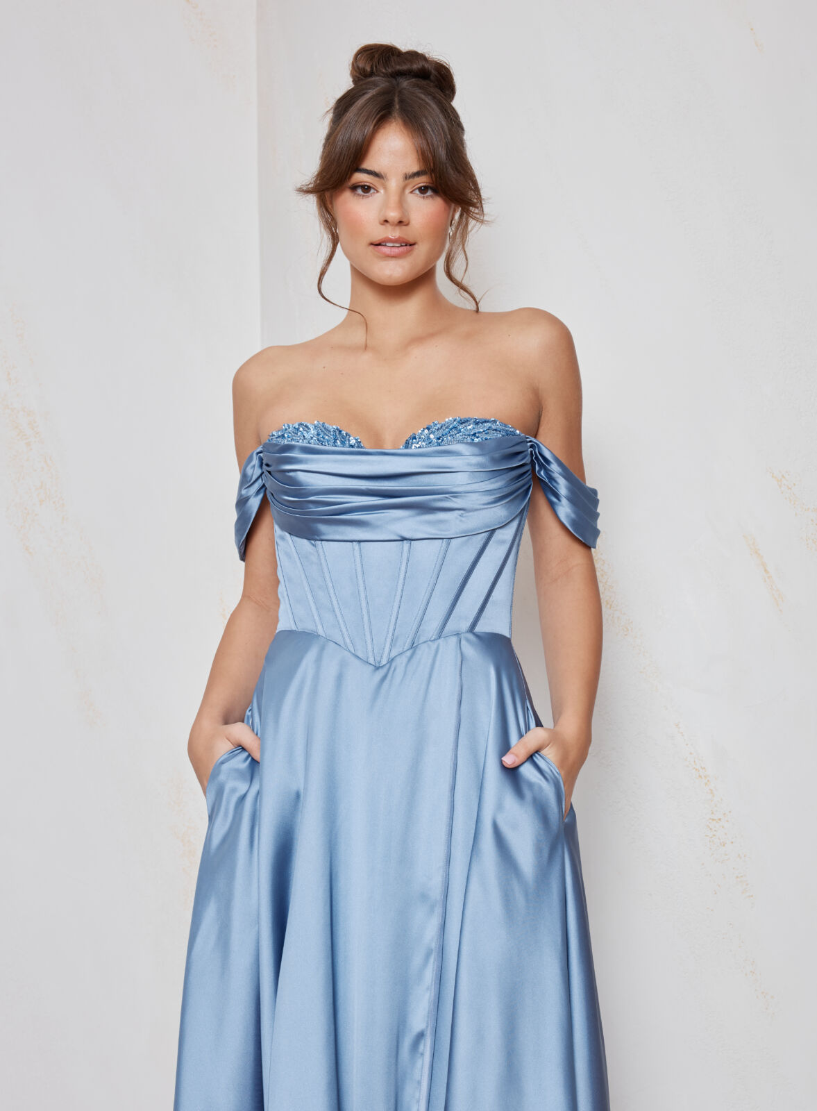 Description: Satin boned corset lace up back A line ball gown with beaded peep bust details and pleated drape off the shoulder straps