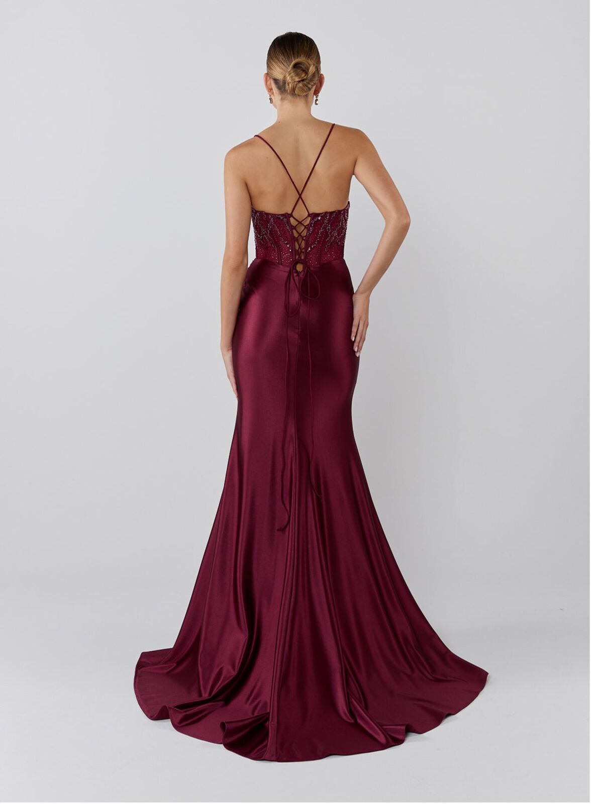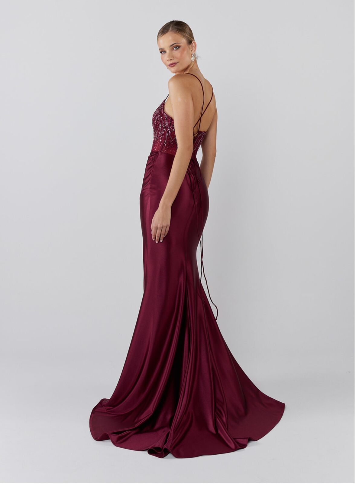 Description: Sheer waist jewelled embroidered bodice slim line gown with wrap stretch gloss jersey body and split
